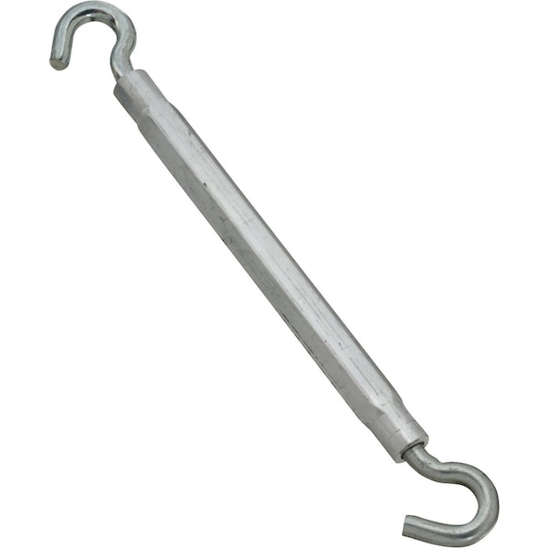 National catalog model No. 2174BC hook/hook turnbuckle zinc plated. Designed for tightening or drawing together various lines and cables. Hex body allows for ease of adjustment by hand or with a wrench. Steel wire hook on both ends. Extruded aluminum body.