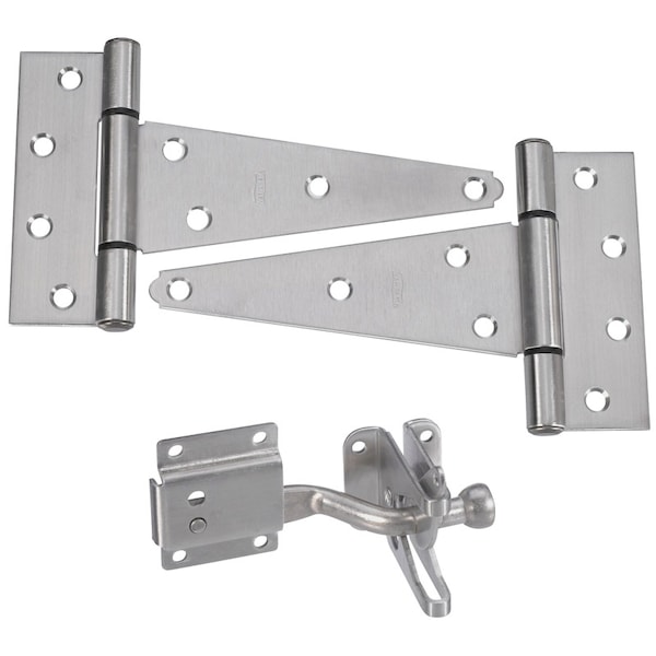 Designed for surface applications on doors, gates and sheds. Popular tee hinge and latch set includes two hinges, one latch and necessary fasteners.