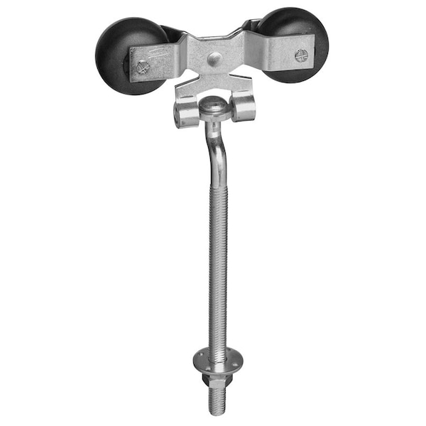 The 1/2 inch offset 9 inch bolt (with 7 inch thread) adjusts door vertically and laterally (1 inch) from inside building.