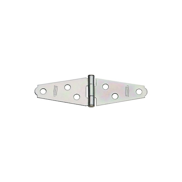 National Hardware Strap Hinge, 18 lb Weight, Number of Holes: 6, Pin Type: Fixed, Door Leaf Height: 1.87 in, Door Leaf Length: 1.87 in, Leaf Thickness: 0.05 in, Frame Leaf Width: 1-1/16 in, Pin Diameter: 0.119 in, Wall Mounting, Steel, Zinc, Dimensions: 3-3/4 in