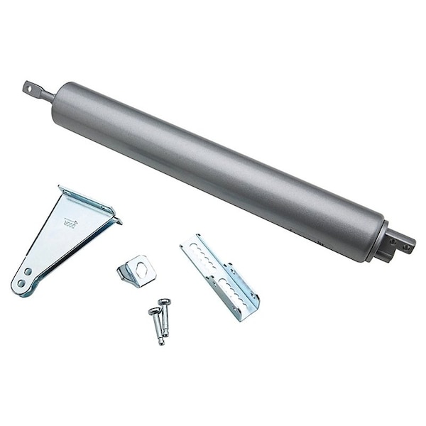 Aluminum tube steel rod, steel jamb and steel door brackets. Heavy-duty air controlled door closer is designed for use on out swinging wood or metal doors up to 1-3/8 in thick. Door closing speed is fully adjustable. Two hole end plug allows closing force to be regulated. Includes convenient hold-open'' washer. Extended operating life as closer is permanently lubricated. Visual pack.''