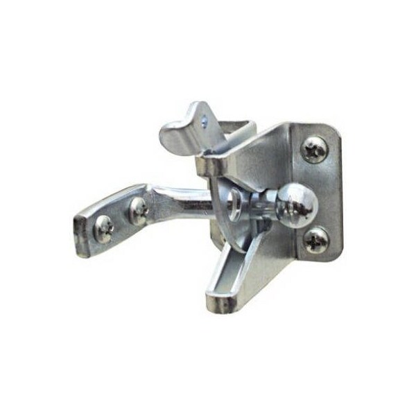 Zinc Gate Latch, Designed With Angled Bar For Out Swinging Gates, Strike Can Mounted Either On Post Or Gate, Latches Automatically, Can Be Padlocked, For Right Or Left Hand Applications, Hole Punched in Release Lever Is For Rigging Cord Release From Opposite Side, With Screws
