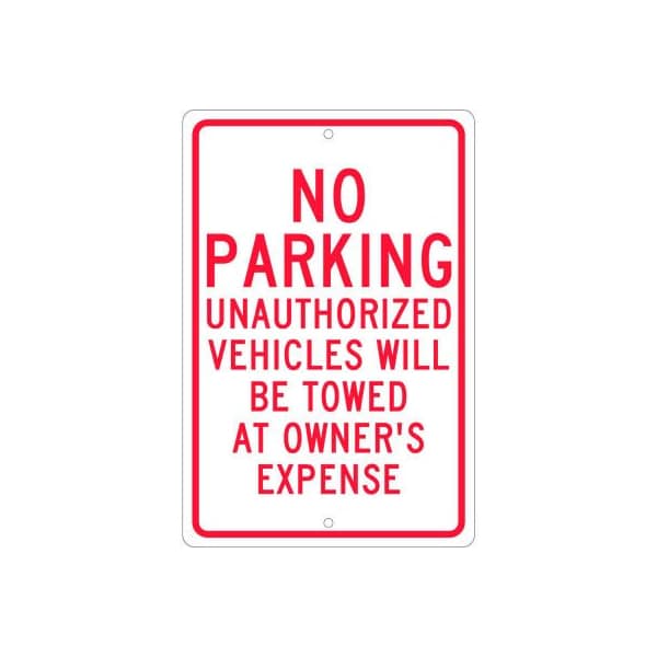 Traffic & parking lot sign top quality impact and corrosion resistant .063 aluminum sign has a glossy baked enamel finish. Pre-drilled for easy mounting. text on sign: no parking unauthorized vehicles will be towed at owner's expense
