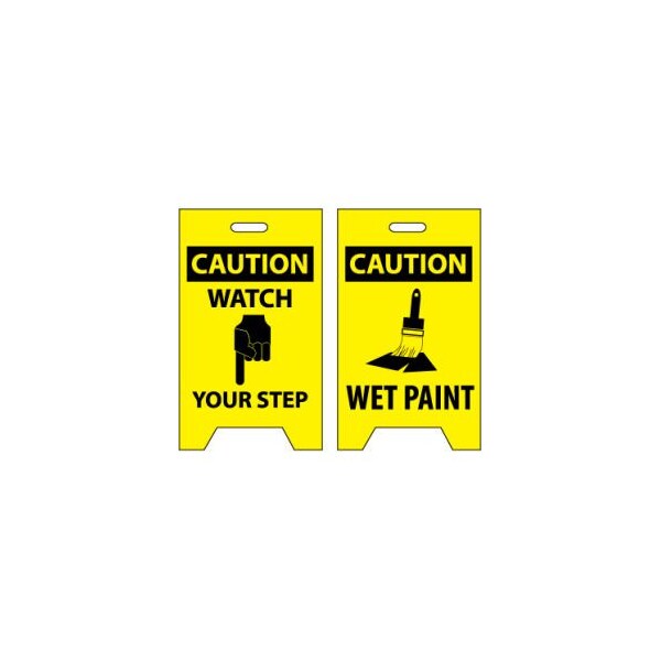 Floor signs facility floor signs: caution: watch your step/wet paint this convenient sign has two messages printed on it: one on the inside of the plastic base, and one on the outside. Made of lightweight 4 mil corrugated polyethylene, this sign is completely water proof. When not in use, simply fold up and store away to save space.