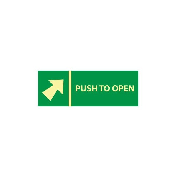 Glow fire safety signs fire safety signs push to open w/ arrow -pressure sensitive vinyl glow fire safety signs feature large text and easily understood graphics to increase first glance comprehension. Signs comply with osha & nfpa requirements. Signs do not require mechanical or electrical power source. Provides an illumination duration time of 6+ hours. Meets osha and astm requirements.