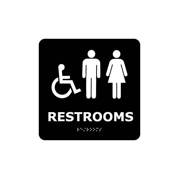 Braille signs graphic braille signs restroomsw/symbol black ada regulations require the marking of permanent rooms and spaces with braille for the visually impaired. This grade ii braille sign features white text for maximum visibility. Braille is 1/32 raised uppercase text with a 5/8 minimum letter height. Sign is 8 x 8 made from styrene plastic graphics adhered to a pvc background.