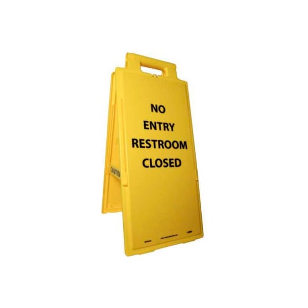 Heavy duty floor sign - no entry restroom closed this highly visible yellow sign has raised black text and graphics for maximum visibility. Made of lightweight 4 mil. Corrugated polyethylene. Impact-resistant for long lasting durability. Ridged pattern on feet minimizes contact with surface so sign doesn't scar floor. Folds flat for storage when not in use. Measures 24-5/8 x 10-3/4.