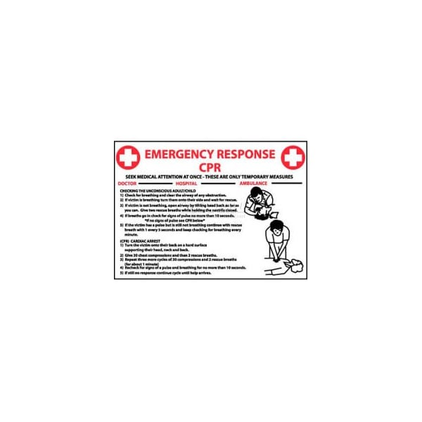Nmc m459rb sign, cpr emergency response, 10 x 14, white/red/black post instructions for how to administer cpr in the event of an emergency.