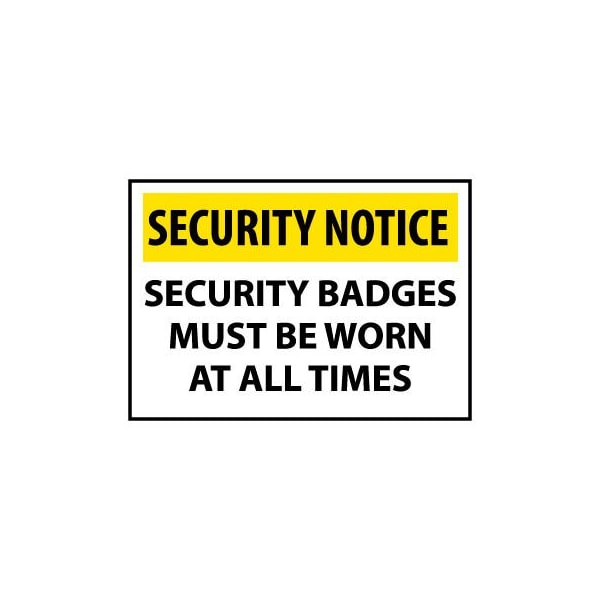 Security notice signs security notice signs security badges must be worn at all times let everyone know the policies within your facility!! this 14 x 20 sign features large text and graphics with a bright yellow bar at the top to attract attention. aluminum signs are made with .40 reinforced baked enamel for long-lasting durability. Corrosion and uv resistant.