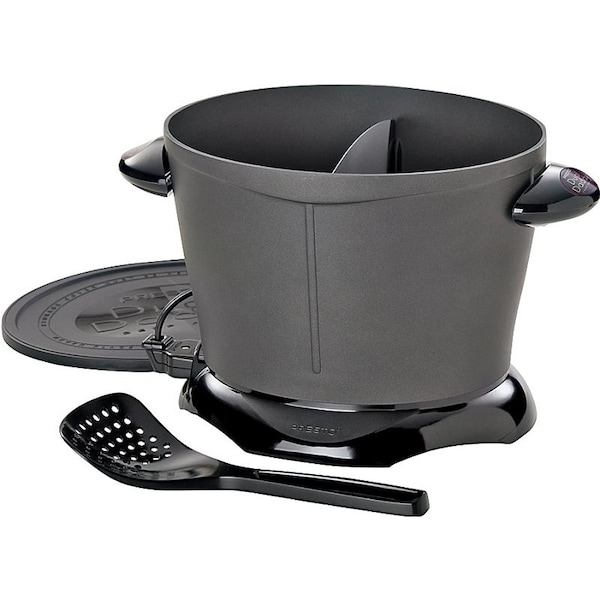 Big capacity, allows up to 8 cups of fried food. Use with handy divider to fry 2 foods at one time with no intermingling of foods or flavors or without divider to fry large pieces of chicken or fish. Oval-shaped, heavy cast-aluminum body with non-stick finish inside and out for easy cleaning. Frying temperature maintained automatically with no controls to set or watch. Snap-on lid allows oil to be stored in fryer. Includes slotted scoop. 120 VAC, 1500 W. UL listed.