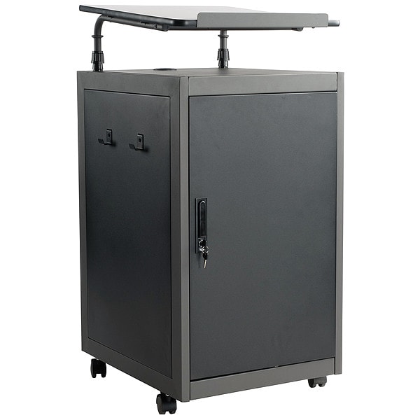 Lectern, Color Charcoal, Mobility Mobile, Material Plastic, Overall Height 41 in, Overall Width 20 in, Overall Depth 24 in, Includes Document Rail Yes, Includes Sound System No, Includes Built-In Mesh Front, Locking Storage Cabinet For Security, Metal Bookstop, Wire Management Grommet For Technology Equipment