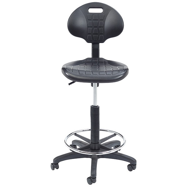 Drafting Chair, Adjustable Arms Not Applicable, Overall Width 26 in, Overall Depth 17 in, Maximum Seat Height 32 in, Maximum Overall Height 48 in, Seat Color Black, Frame Color Black, Seat Thickness 1 1/4 in, Back Color Black, Seat Depth 17 in, Seat Width 18 in, Seat Material Polyurethane, Back Material Polyurethane, Caster/Glide Type Mushroom Glides, Frame Material Steel, Number of Arms 0, Weight Capacity 300 lb, Tilt Configuration Freely Locking Tilt, Series Polyurethane Task Stool