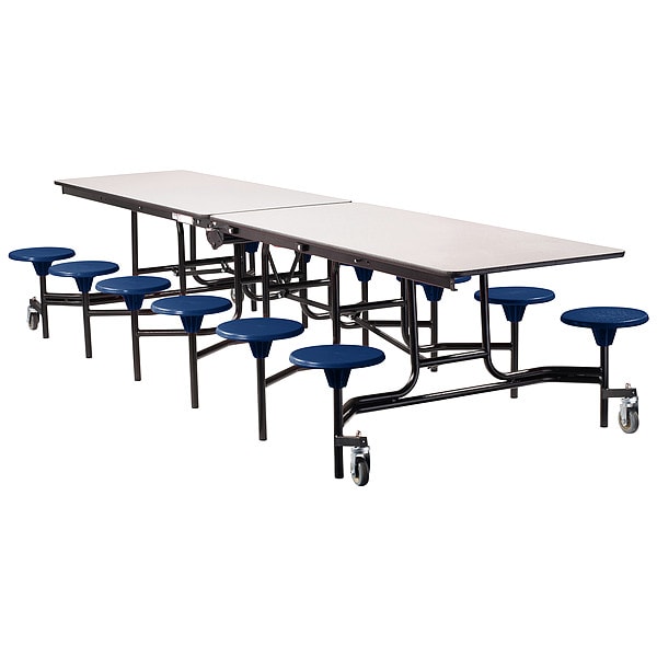 Cafeteria Stool Table, Seats 12, Shape Rectangle, Width 145 in, Depth 59 in, Height 29 in, Tabletop Color Family Gray, Tabletop Color Gray Nebula, Table Material MDF, Assembled/Unassembled Assembled, Seat Height 17 in, Surface Material High Pressure Laminate, Frame Material Steel, Caster Type (4) Swivel, Chair Color Navy, Edge Color Black, Edge Type Protect Edge, Frame Color Black, Top Thickness 3/4 in, Series MTS