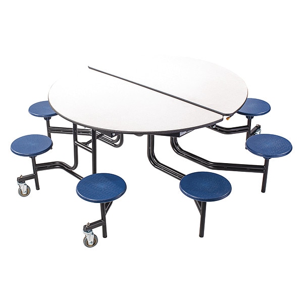Cafeteria Stool Table, Seats 8, Shape Round, Diameter 60 in, Width 81 in, Depth 80 in, Height 29 in, Tabletop Color Family Gray, Tabletop Color Gray Nebula, Table Material Industrial Grade Laminated Particleboard, Assembled/Unassembled Assembled, Seat Height 17 in, Surface Material High Pressure Laminate, Frame Material Steel, Caster Type (4) Swivel, Chair Color Blue, Edge Color Black, Edge Type T-Molded, Frame Color Black, Top Thickness 3/4 in, Series MTR