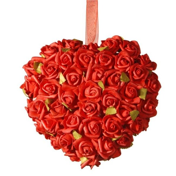 This bright and beautiful flowered piece features blooms of tiny red roses in tight clusters all around to form a fluffy heart-shaped decoration. Peaking through are green leaves for a contrast in colors. This two-sided piece with foam center has a 3" long red ribbon for ease in hanging. Display as a decoration for Valentines Day or other similar special occasion celebrations.