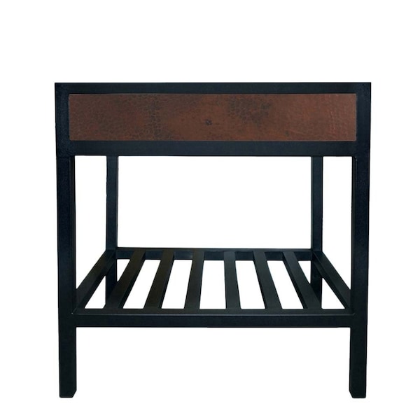 Expertly artisan crafted, Cuzco vanity base in Antique copper pairs the sublime texture of hand hammered copper with the enduring beauty of steel. Copper accent panels add texture and visual interest. Pair with any of Native Trails' stone or copper vanity tops. Available in three sizes for flexibility in your design; insets also available in Brushed Nickel and Carrara marble.