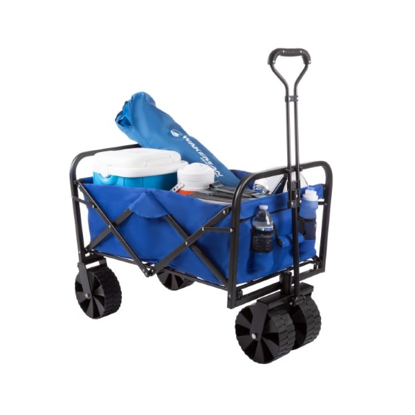 Tackle all your lawn and garden chores with ease with the Collapsible Utility Wagon by Nature Spring. When expanded, the wagon has a length of 33.75 inches and a 176-pound capacity, making it big enough to carry everything from bags of mulch and compost from the car to the garden, lawn care tools, sports equipment or groceries. You can even use it to take coolers, umbrellas and chairs to the beach, park or outdoor concerts. The handle telescopes to a maximum length of 33-in to reduce strain on your back as you pull. The handle is attached to the easy-pivot front axle to make the wagon easy to maneuver over sand, dirt, grass or gravel and has a locking mechanism to keep it in place when you don't need to move the wagon. The 8-inch wheels give the cart higher clearance to protect it from obstacles in your yard or garden bed, and the metal frame is powder coated to resist rust and corrosion. This folding cart collapses in seconds by pulling the tab in the middle of the wagon bottom. The wagon is incredibly compact when folded, measuring just 8 inches wide and 20 inches long, so it can either be stored in small spaces or hung up on a garage or shed wall to free up floor space. The body of the folding cart is made of 100 Percent 600D polyester, and it cleans easily with a soft, damp cloth to be ready for your next yard or garden project. The front of the wagon also has two mesh cup holders,so you can have drinks handy when you need to take a break from gardening or landscaping on hot days. This wagon is not intended to carry children.