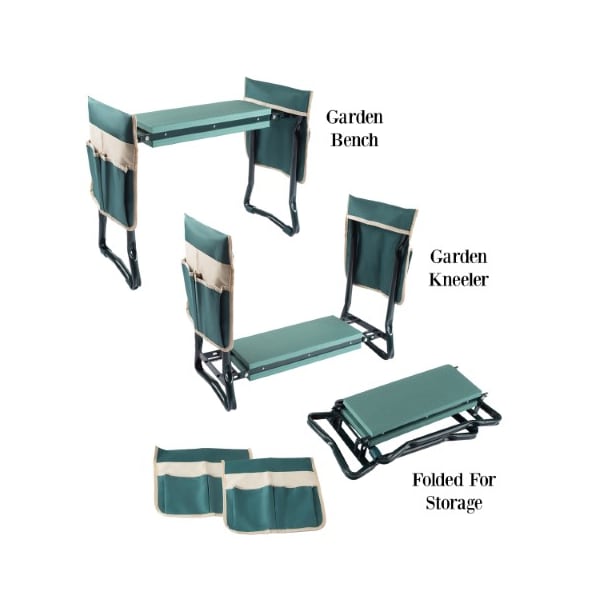 Comfortably keep your lawn or garden looking beautiful with the Gardening Kneeling Bench by Nature Spring. This dual-purpose bench features a durable steel frame that folds for compact storage, two handles with convenient tool pouches, detachable leg protectors and an EVA foam pad with ample cushioning for your knees, hips and back while kneeling. Whether you are planting flowers, pulling weeds or picking vegetables in the garden, this versatile bench will reduce aches and keeps your knees off the soiled ground.