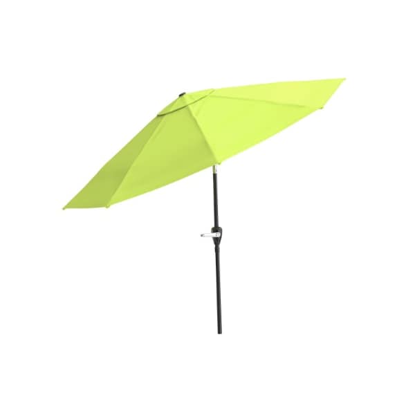 The 9-Foot tall Patio Umbrella from Nature Spring uses a hand crank to easily open its 10-foot wide canopy and tilts at a 60-degree angle automatically with a push of a button to shade your outdoor area at any part of the day. The resilient lime green polyester fabric of the umbrella has built-in vents and is supported with 8 steel ribs so you can use it on your back deck, patio, poolside, or with an outdoor dining set in the backyard. The 1.9-inch diameter powder-coated aluminum pole is rust-resistant to help keep this attractive umbrella looking new and your guests cool and protected from the sun's harsh UV ray's year-after-year!