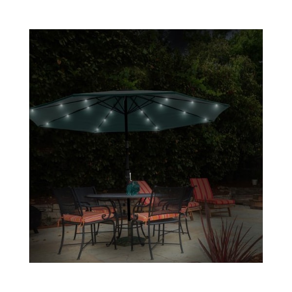 The 10-foot Patio Umbrella with LED Lights from Nature Spring uses a hand crank to easily open its canopy to keep your guests cool and protected from the sun's harsh UV rays, or your table illuminated after dusk. This attractive umbrella features 24 LED lights powered by a solar panel that recharges the included battery pack, a 1.75-inch diameter powder-coated aluminum pole that is rust-resistant, and it also tilts at a 60-degree angle automatically with a push of a button to shade your outdoor area at any part of the day. The resilient hunter green colored polyester fabric of the umbrella has built-in vents and is supported with 8 steel ribs so you can use it on your back deck, patio, poolside, or with an outdoor dining set in the backyard.
