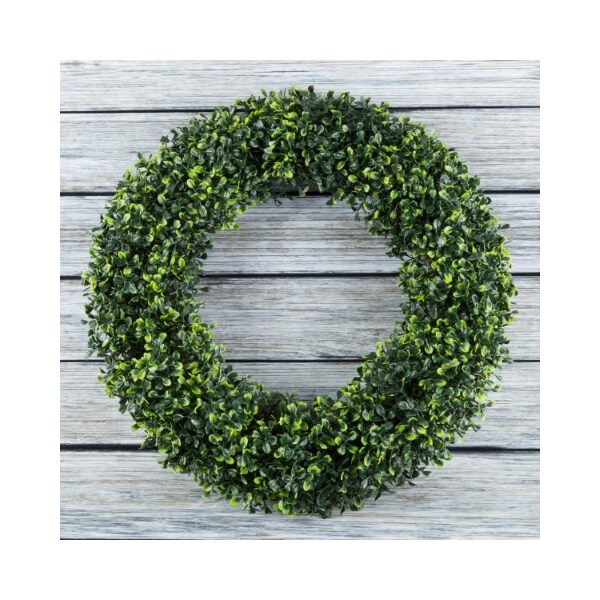 The 19.5-inch diameter Artificial Boxwood Wreath from Nature Spring is full of UV resistant lush greenery for use all year around indoors or outdoors. This hassle-free wreath is accented with natural looking brown twigs at the base, can hang on the front of a door, over the mantle, or on any wall, and it can be decorated to create a striking accent piece in any home or office setting.