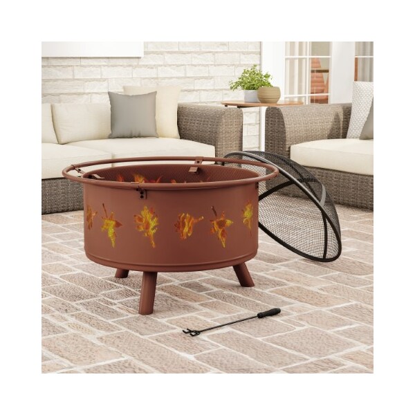 The 32-inch Round Outdoor Leaf Fire Pit from Nature Spring will enhance evenings on the patio while providing warmth for your family and friends. The portable steel fire pit features a round rugged rust colored steel frame, a handy log poker, a mesh spark screen, and a decorative leaf pattern exterior that will create visual interest to your outdoor area. Sitting around a real wood fire and roasting s'mores with your kids has never been easier, regardless the size of your backyard!