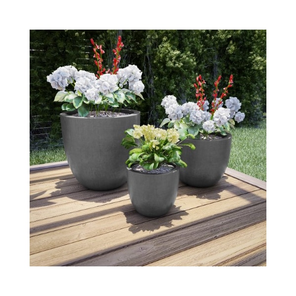 The set of 3 Fiber Clay Planter Pots from Nature Spring will enhance the look of your plants with the adorable modern gray coloring and varying sizes while they sit on your patio, deck, porch, along a sidewalk, or in your garden. Fill the 17.75-inch, 13.75-inch, and 9.75-inch round planters with your favorite flowers, vegetable plant, or greenery. These indoor-outdoor pots have fiberglass mixed in with the clay to make them lightweight for handling, weather resistant for lasting use, and an attractive gift for someone special.