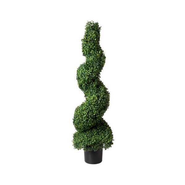 The 50-inch Artificial Boxwood Topiary Tree from Nature Spring is shaped in a spiral design that is full of UV resistant lush greenery for use indoors or outdoors. This hassle-free 50-inch tall faux tree has a natural looking trunk and is potted in a 7-inch pot that can be placed in your own planter to create a striking accent piece in any home or office setting.