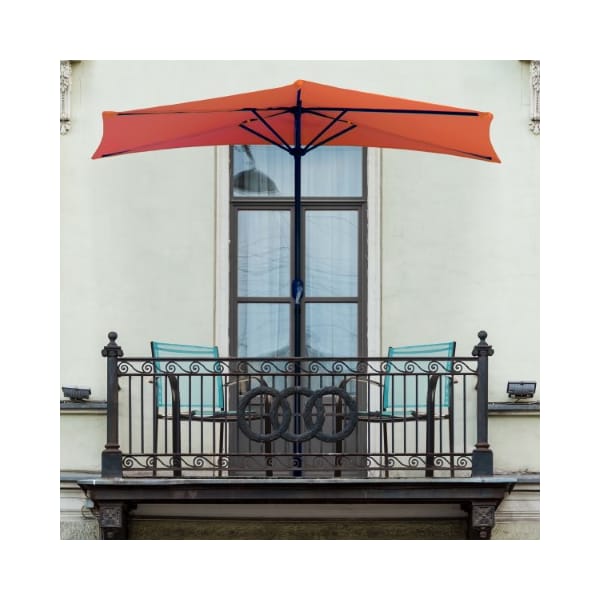 The 9-Foot Half-Canopy Patio Umbrella from Nature Spring uses a hand crank to easily open to shade a small outdoor area at any part of the day. The resilient terracotta colored polyester fabric of the umbrella has built-in vents and is supported with 5 steel ribs so you can use it against your house on your back deck, patio, balcony, or porch. The 1.5-inch diameter steel pole fits in most umbrella stands, weighted bases, or patio tables (not included) to help keep you protected from the sun's harsh UV ray's year-after-year!