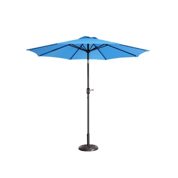 The 9-foot Patio Umbrella from Nature Spring uses a hand crank to easily open its canopy and tilts in 5 positions with a push of a button to shade your outdoor area at any part of the day. The resilient bright blue colored polyester fabric of the umbrella has built-in vents and is supported with 8 steel ribs so you can use it on your back deck, patio, poolside, or with an outdoor dining set in the backyard. The powder-coated aluminum pole is rust-resistant to help keep this attractive umbrella looking new and your guests cool and protected from the sun's harsh UV ray's year-after-year!