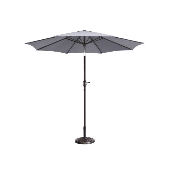 The 9-foot Patio Umbrella from Nature Spring uses a hand crank to easily open its canopy and tilts in 5 positions with a push of a button to shade your outdoor area at any part of the day. The resilient gray colored polyester fabric of the umbrella has built-in vents and is supported with 8 steel ribs so you can use it on your back deck, patio, poolside, or with an outdoor dining set in the backyard. The powder-coated aluminum pole is rust-resistant to help keep this attractive umbrella looking new and your guests cool and protected from the sun's harsh UV ray's year-after-year!