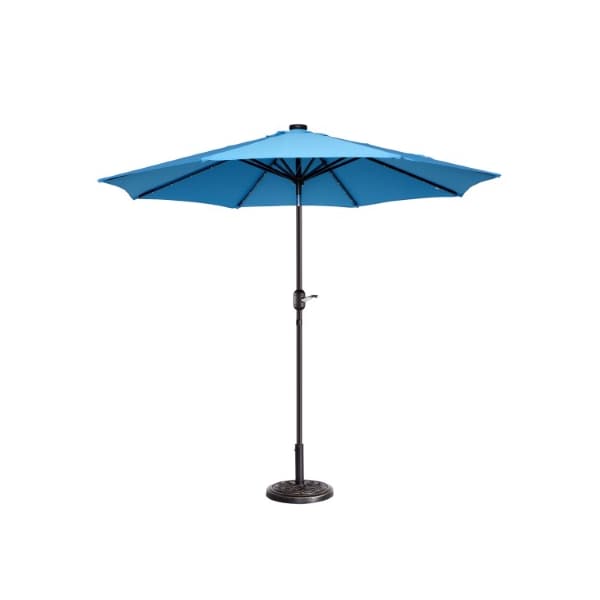 The 9-foot Patio Umbrella with LED Lights from Nature Spring uses a hand crank to easily open its canopy to keep your guests cool and protected from the sun's harsh UV rays, or your table illuminated after dusk. This attractive umbrella features 32 LED lights powered by a solar panel that recharges the included battery pack, a powder-coated steel pole that is rust-resistant, and it also tilts in 5 positions with a push of a button to shade your outdoor area at any part of the day. The resilient lake blue polyester fabric of the umbrella has built-in vents, a tie strap to secure the canopy to the pole when closed, and is supported with 8 steel ribs so you can use it on your back deck, patio, poolside, or with an outdoor dining set in the backyard.