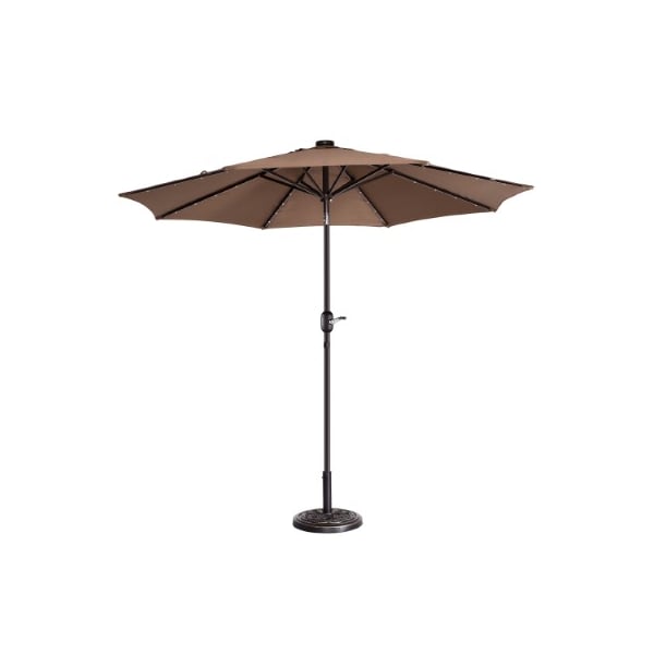 The 9-foot Patio Umbrella with LED Lights from Nature Spring uses a hand crank to easily open its canopy to keep your guests cool and protected from the sun's harsh UV rays, or your table illuminated after dusk. This attractive umbrella features 32 LED lights powered by a solar panel that recharges the included battery pack, a powder-coated steel pole that is rust-resistant, and it also tilts in 5 positions with a push of a button to shade your outdoor area at any part of the day. The resilient brown polyester fabric of the umbrella has built-in vents, a tie strap to secure the canopy to the pole when closed, and is supported with 8 steel ribs so you can use it on your back deck, patio, poolside, or with an outdoor dining set in the backyard.