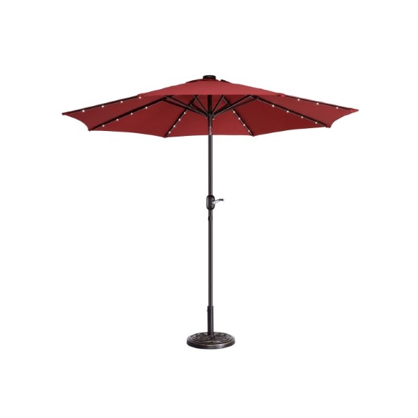 The 9-foot Patio Umbrella with LED Lights from Nature Spring uses a hand crank to easily open its canopy to keep your guests cool and protected from the sun's harsh UV rays, or your table illuminated after dusk. This attractive umbrella features 32 LED lights powered by a solar panel that recharges the included battery pack, a powder-coated steel pole that is rust-resistant, and it also tilts in 5 positions with a push of a button to shade your outdoor area at any part of the day. The resilient red polyester fabric of the umbrella has built-in vents, a tie strap to secure the canopy to the pole when closed, and is supported with 8 steel ribs so you can use it on your back deck, patio, poolside, or with an outdoor dining set in the backyard.