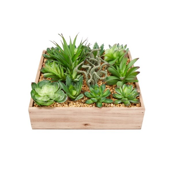 The Artificial Succulent Arrangement from Nature Spring will add a splash of color to your home with its gorgeous greenery and intriguing texture. Set in rustic wood box planter with a low profile and a stable base for use on any surface, this arrangement of mixed faux succulents is sure to complement any home or office decor.