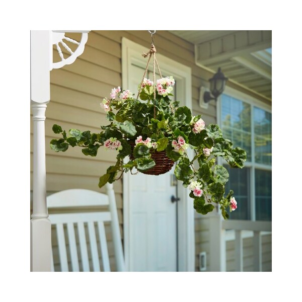 The Faux Pink Geranium Hanging Plant from Nature Spring will add a splash of color to your home with its vibrant flowers bursting out of the beautiful wicker basket. Certain to brighten up any indoor or covered outdoor space, this 21-inch diameter faux flowering plant has plenty of pink polyester petals and green leaves with life-like detail that offers depth and texture to almost any style decor. The pre-attached jute ropes makes it simple to hang this artificial hanging basket along the pillars of a porch, in a four-seasons room, around the lanai, under a gazebo, or in the lobby of a commercial building - the possibilities are endless.