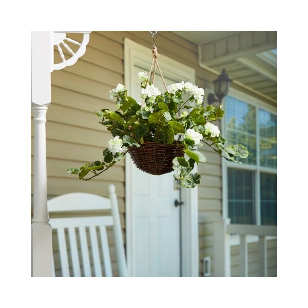 The Faux White Geranium Hanging Plant from Nature Spring will add a splash of color to your home with its vibrant flowers bursting out of the beautiful wicker basket. Certain to brighten up any indoor or covered outdoor space, this 21-inch diameter faux flowering plant has plenty of polyester petals and green leaves with life-like detail that offers depth and texture to almost any style decor. The pre-attached jute ropes makes it simple to hang this artificial hanging basket along the pillars of a porch, in a four-seasons room, around the lanai, under a gazebo, or in the lobby of a commercial building - the possibilities are endless.