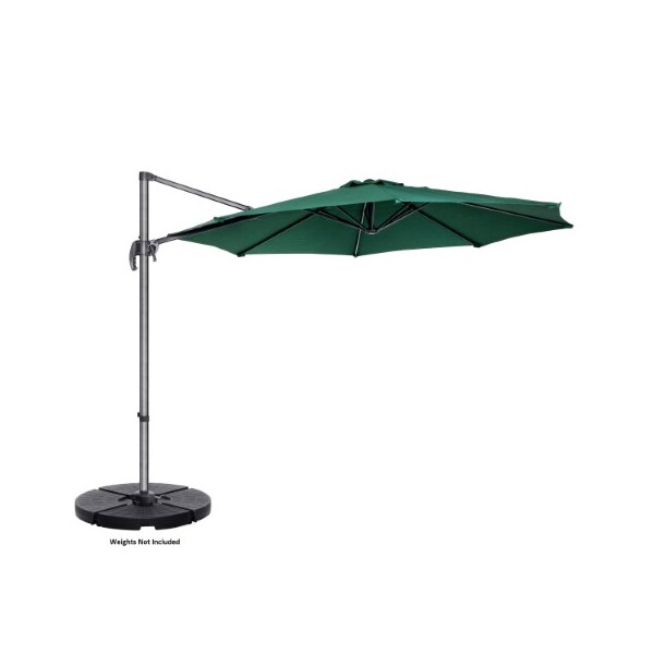 The 10-Foot Offset Patio Umbrella from Nature Spring uses a hand crank to easily open the canopy that can tilt vertically in 5 positions to shade your outdoor area at any part of the day. The rust-resistant powder-coated steel pole is offset for freestanding use without a table and has a stable cross base that can fit into most umbrella bases (not included) or weighted down with sandbags. The resilient forest green polyester fabric of the umbrella has built-in vents and is supported with 8 steel ribs so you can use it on the side of a picnic table, over poolside lounge chairs, on the back deck, patio, or with an outdoor dining set in the backyard.