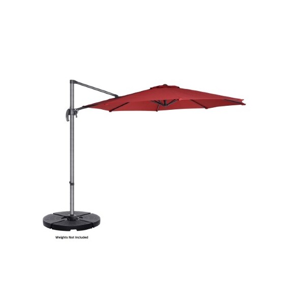 The 10-Foot Offset Rotating Patio Umbrella from Nature Spring uses a hand crank to easily open the canopy that can rotate in 360-degrees and tilt vertically in 5 positions to shade your outdoor area at any part of the day. The rust-resistant powder-coated steel pole is offset for freestanding use without a table and has a stable cross base that can fit into most umbrella bases (not included) or weighted down with sandbags. The resilient market red polyester fabric of the umbrella has built-in vents and is supported with 8 steel ribs so you can use it on the side of a picnic table, over poolside lounge chairs, on the back deck, patio, or with an outdoor dining set in the backyard.