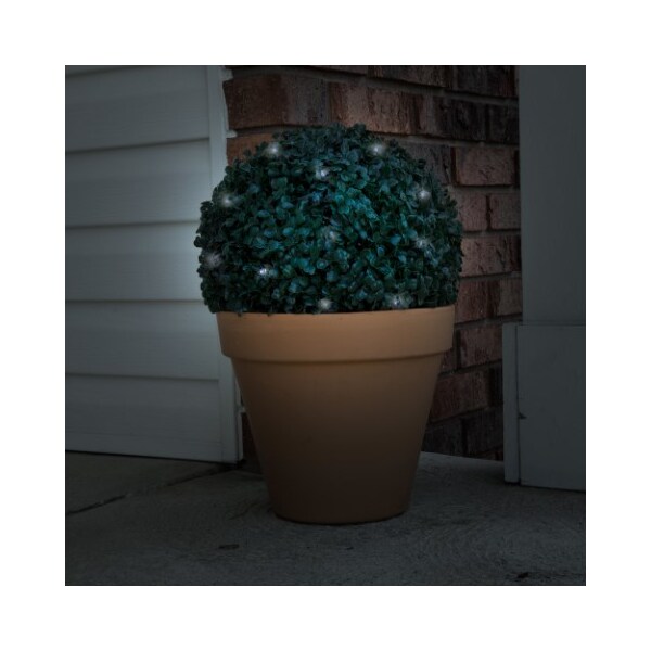 Add beautiful illumination and stylish decoration to your doorway or patio with the LED Solar-Powered Topiary Ball by Nature Spring! The 20 white mini LED lights throughout the topiary ball emit a soft glow look that creates a relaxing ambiance to your outdoor space. This decorative artificial topiary is durable, and UV stabilized, making it weather resistant and low maintenance. The solar panel includes a rechargeable battery and has an extra-long 6 ft. cord so you can position the topiary ball in many different locations while keeping the solar panel exposed to the sun. Energy-saving LED lights are recharged by the solar panel during the day under the sunlight and turn on automatically at dusk and off at dawn. This solar-powered topiary ball is a great way to add a lush look to your porch, patio or any outdoor living area. Simply hang it or display it in a pot. You can use this as decorative shrubbery and mood lighting for special events such as weddings, birthday parties and corporate functions. The bottom of the plant is weighted to help it wIt'stand the wind and the elements outdoors.