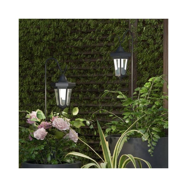 The set of two Solar Powered Coach Lanterns with Shepherds Hooks from Nature Spring will light up your porch, patio, pathways, driveways, and outdoor landscaping without the need of cords or replacing batteries. These weather-resistant lamps feature LED lights and solar panels on each fixture that charge the provided rechargeable AAA batteries. Hang each of the lanterns on the included shepherds hooks that easily stake into the ground to illuminate your pool, garden, pond, deck, or outbuilding for up to 6 hours on a full charge.