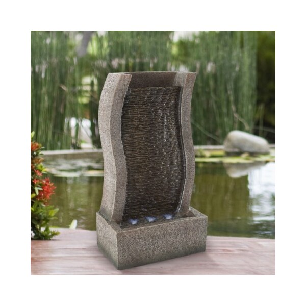 Create your own calming backyard oasis with the freestanding Stone Wall Fountain by Nature Spring. This outdoor water feature is made of durable polyresin to resist the elements and corrosion from circulating water. The fountain is hand painted for a unique look and has a curved contemporary design that is sure to complement almost any backyard decor. The fountain includes a recirculation pump for continuous water flow and features 3 LED lights on the bottom tier that provide a soft, warm glow so you can enjoy a relaxing atmosphere. The fountain easily sets up in minutes and is powered by a 10-foot wall outlet cord so it can be placed almost anywhere on your deck, patio or in your backyard.