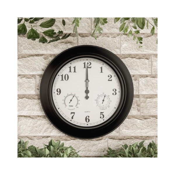 The Wall Clock Thermometer is a necessity for any home! This convenient piece features accurate quartz timekeeping and also measures both temperature and humidity; it's great to have in all seasons. With a sleek black finish, this hanging clock thermometer is a wonderful addition to any area of the home, indoors or outside; hang it by your pool patio, porch, deck, kitchen, or sunroom. Equipped with an 18-in display face, you can easily read the temperature at glance, while the waterproofing and sturdy steel construction ensures that the gauge will survive any weather conditions. It's an attractive and functional piece for your home!