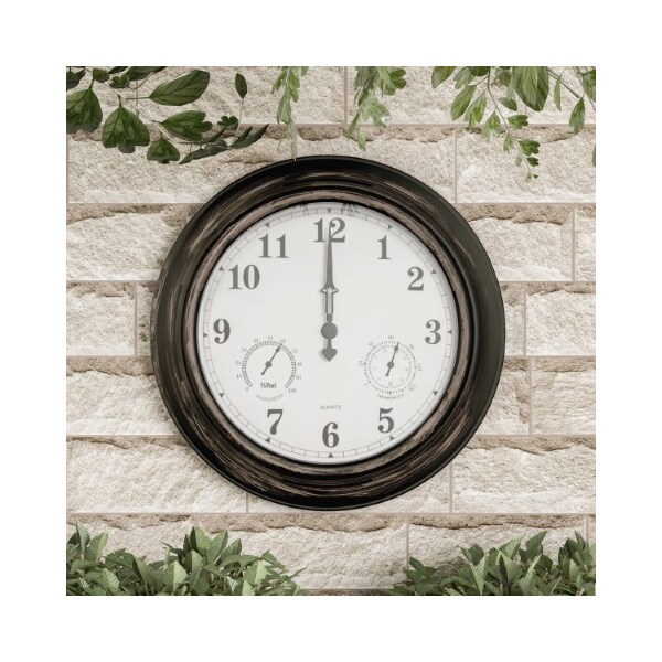 The Wall Clock Thermometer is a necessity for any home! This convenient piece features accurate quartz timekeeping and also measures both temperature and humidity; it's great to have in all seasons. With a sleek antique bronze finish, this hanging clock thermometer is a wonderful addition to any area of the home, indoors or outside; hang it by your pool, patio, porch, deck, kitchen, or sunroom. Equipped with an 18-in display face, you can easily read the temperature at glance, while the waterproofing and sturdy steel construction ensures that the gauge will survive any weather conditions. It's an attractive and functional piece for your home!
