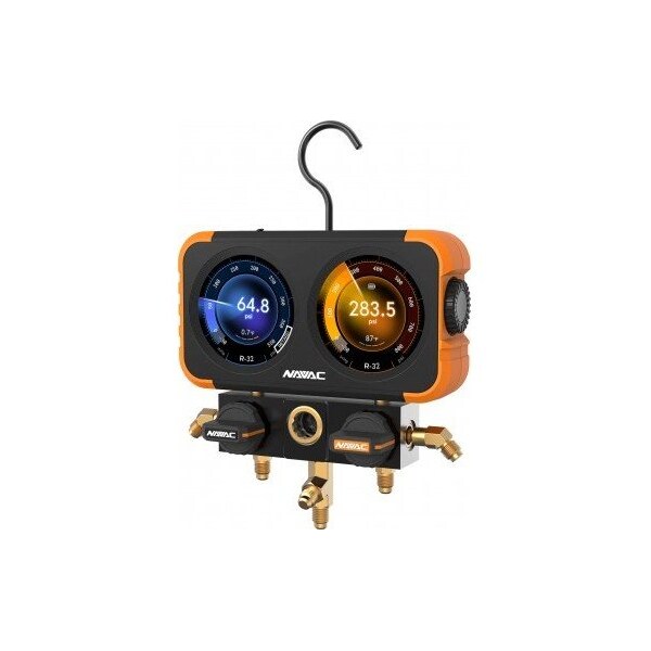 FULLY COMPATIBLE WITH A2L REFRIGERANTS, IT SUPPORTS 72 REFRIGERANTS, REPLACING THE NEED FOR MULTIPLE ANALOG GAUGES COMMONLY ASSOCIATED WITH SUBSTANTIAL COSTS IN TIME, SPACE, AND MONEY. IT FEATURES A DURABLE ALUMINUM BODY, IP54 IMPACT-RESISTANT RUBBER COVER, AND A FOLDABLE HOOK, ENSURING RELIABILITY AND PORTABILITY.