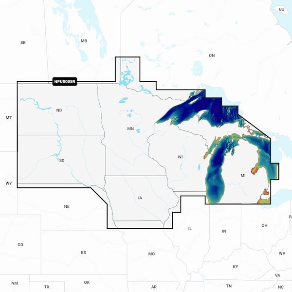 NPUS005R - U.S. North Get the world No. 1 choice in marine mapping - with the best, most up-to-date Navionics Platinum+ cartography on your compatible chartplotter. For offshore or inland waters, this all-in-one solution offers detail-rich integrated mapping of coastal waters, lakes, rivers and more. Get SonarChart 1’ 0.5 meter HD bathymetry maps, advanced features such as dock-to-dock route guidance technology, live mapping and Plotter Sync to provide wireless access to daily updates. The Navionics Chart Installer software also ensures the freshest chart data every time out. Navionics dock-to-dock route guidance solutions give you a suggested path to follow through channels, inlets, marina entrances and more. Multiple shading options aid in shallow water navigation and make it easy to highlight a target depth range for the best fishing spots. Navionics Platinum+ charts include all the content of Navionics+ cartography, with integrated offshore and inland mapping, 42,000+ lakes and additional viewing options for relief shading, satellite imagery with SonarChart shading overlay, 3D perspective view, aerial photos, and more. Chart Code - NPUS005R Coverage Area: Coverage of the lakes and rivers of Iowa, Michigan, Minnesota, North Dakota, South Dakota, Wisconsin, and the U.S. waters of the Great Lakes that border those states. Features: Nautical Chart Comprehensive charts are derived from multiple officials, government, and private sources, displayed in a familiar look and feel SonarChart HD Bathymetry - Innovative 1ft 0.5 m bathymetry charts are created by using Navionics proprietary systems that augment existing content with sonar data contributed by the boating community Community Edits - Get useful local knowledge from edits made by users of the Navionics Boating app on your compatible smart device. Daily Updates - Up to 5,000 daily updates to our charts give you the most accurate, most current Navionics data available.1 Dock-to-dock Route Guidance2 - Start your trip with a suggested path. SonarChart Live Mapping Feature - Watch new HD depth maps develop in real-time as your boat moves through the water. Advanced Map Options - Customize your view to focus on the details that matter most Plotter Sync