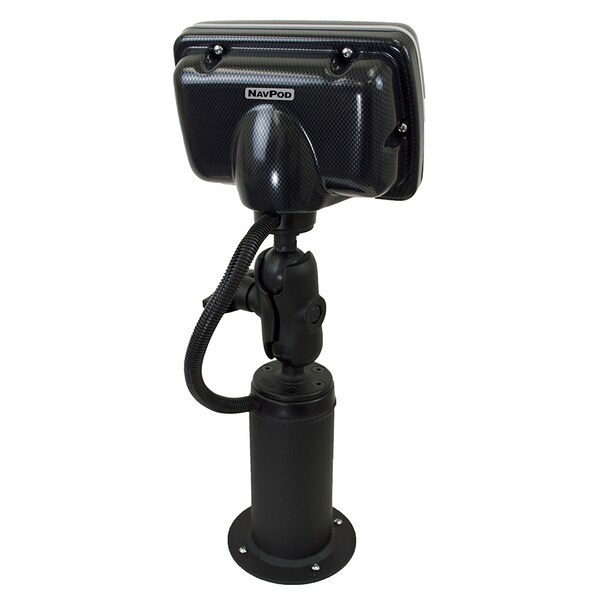 PedestalPod with RAM Mount Pre-Cut for Lowrance Hook 2 -7/7x Fishfinder/Chartplotter - Carbon Black. PedestalPod with RAM Mounts is specifically designed for mounting the fishfinder near the bow on Bass Boats. Built on the foundation of NavPods popular range of waterproof housings for marine electronics, PedestalPods position your fishfinder/chartplotter at an easy to reach 20" off the deck. This allows the user easy access to the display for changes to range, zoom or even control the trolling motor. There is a big difference between reaching down to a height off the deck of 20" to control your fishfinder compared to reaching all the way down to the deck when it was only bracket mounted.. PedestalPods are manufactured with a double gasket system that provides an excellent watertight seal. This offers protection of your fishfinder/chartplotter from the harshest of wet boating conditions. This protection assures reliability and longevity of your marine electronics. PedestalPod with RAM Mounts utilizes the proven RAM Mounting system with the large 2.25" rubber D" size ball and the RAM pin-lock security solution.. RAM Mounts are designed with a patented rubber ball and socket system that allows an almost infinite amount of ways to position the angle of the fishfinder for that precise position of viewing. When you might be trailering, or storing the boat, the display can fold flat onto the deck with only 10" of clearance. This will allow most boat covers to fit over the PedestalPod when not in use. Your fishfinder is easily flush mounted into the pre-cut face of the NavPod. There are pre-cut models available for 7" , 9" and 12" LCD displays from all major marine electronic manufacturers.. PedestalPods are waterproof housings for marine electronics specifically designed for bass boats. PedestalPods are better than bracket mounting. Very sturdy and secure, yet clean and attractive, this mount provides protection of your marine electronics from the harshest of wet boating conditions. PedestalPods provide the convenience of height for accessibility and added security with protection from theft.. PedestalPods position your fishfinder/chartplotter at 20" off the deck and located near the bow and at a 45-degree angle for ease of viewing while fishing. This allows the user to easily reach and access the fishfinder/chartplotter for changes to range, zoom or even control the trolling motor.