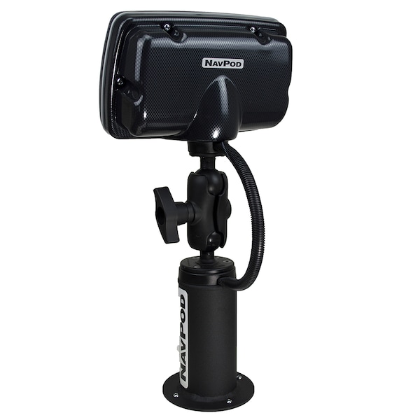 PedestalPod for RAM Mount Pre-Cut for Lowrance Elite-9 CHIRP 9 Fishfinder/Chartplotter - Carbon Black. PedestalPod with RAM Mounts is specifically designed for mounting the fishfinder near the bow on Bass Boats. Built on the foundation of NavPods popular range of waterproof housings for marine electronics, PedestalPods position your fishfinder/chartplotter at an easy to reach 20" off the deck. This allows the user easy access to the display for changes to range, zoom or even control the trolling motor. There is a big difference between reaching down to a height off the deck of 20" to control your fishfinder compared to reaching all the way down to the deck when it was only bracket mounted.. PedestalPods are manufactured with a double gasket system that provides an excellent watertight seal. This offers protection of your fishfinder/chartplotter from the harshest of wet boating conditions. This protection assures reliability and longevity of your marine electronics.. The PedestalPod with RAM Mounts utilizes the proven RAM Mounting system with the large 2.25" rubber D" size ball and the RAM pin-lock security solution. RAM Mounts are designed with a patented rubber ball and socket system that allows an almost infinite amount of ways to position the angle of the fishfinder for that precise position of viewing.. When you might be trailering, or storing the boat, the display can fold flat onto the deck with only 10" of clearance. This will allow most boat covers to fit over the PedestalPod when not in use.. Your fishfinder is easily flush mounted into the pre-cut face of the NavPod. There are pre-cut models available for 7" , 9" and 12" LCD displays from all major marine electronic manufacturers.. PedestalPods - Protection, Convenience, Security..