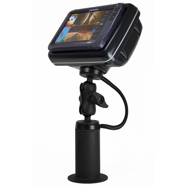 PedestalPod with RAM Mount Pre-Cut for Lowrance HDS-12 Gen2 Touch, HDS-12 Gen3 D" size ball and the RAM pin-lock security solution. RAM Mounts are designed with a patented rubber ball and socket system that allows an almost infinite amount of ways to position the angle of the fishfinder for that precise position of viewing.. When you might be trailering, or storing the boat, the display can fold flat onto the deck with only 10" of clearance. This will allow most boat covers to fit over the PedestalPod when not in use.. Your fishfinder is easily flush mounted into the pre-cut face of the NavPod. There are pre-cut models available for 7" , 9" and 12" LCD displays from all major marine electronic manufacturers.. PedestalPods - Protection, Convenience, Security..
