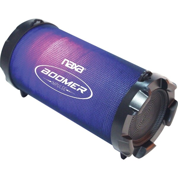BOOMER IMPULSE FLASH Bluetooth Boombox with LED Lights. Liven up the room in style with Naxa's BOOMER IMPULSE FLASH Bluetooth Boombox with LED Lights (NAS3087). The powerful stereo speakers and a dedicated 3" subwoofer delivers and permeates a crystalclear sound throughout any room. The modern multicolor LED lighting effects pulses along the beat, bringing a unique and fresh aesthetic to your home. Stream all your favorite tunes wirelessly via Bluetooth, or utilize the strong, highspeed 3.5mm auxiliary to connect to your external devices. Hit the town and tune in the local FM radio stations. Transition it into a speaker phone and take calls over your smartphone. Easily portable with the included carrying strap.Powerful stereo speakers and dedicated 3" subwoofer.Multicolor LED lighting effects with On/Off switch.Stream music wirelessly from your Bluetooth enabled smartphone, tablet, or laptop.Plays MP3s directly from USB flash drives or microSD cards (32 GB max).3.5 mm AUX connector.Builtin FM radio.Power: Builtin Rechargeable battery (800 mAh), USB charge Accessories included: USB charge cable, AUX cable, carrying strap.